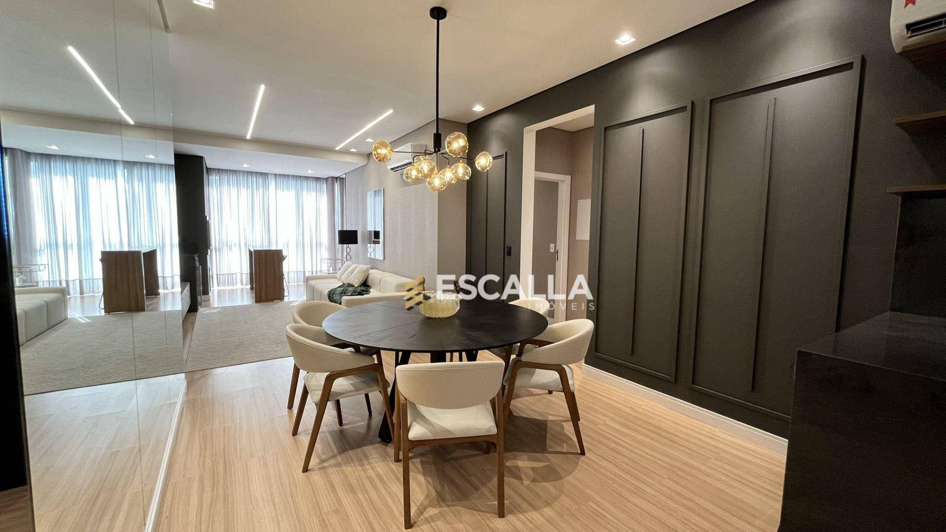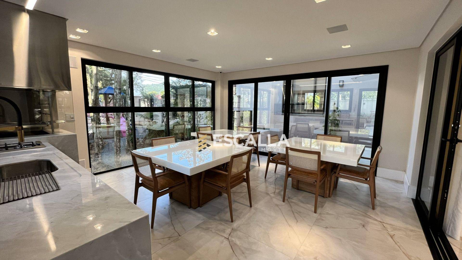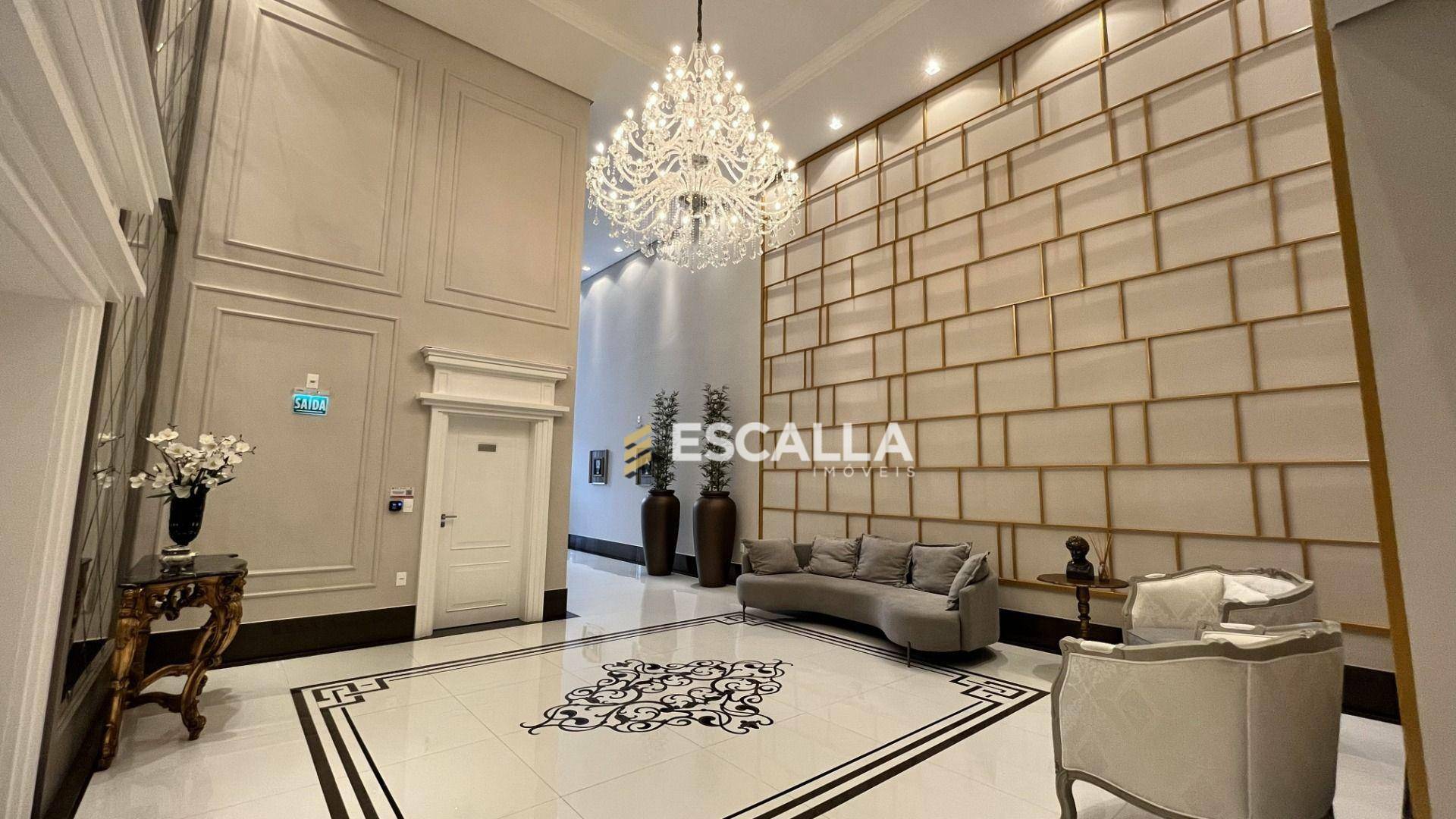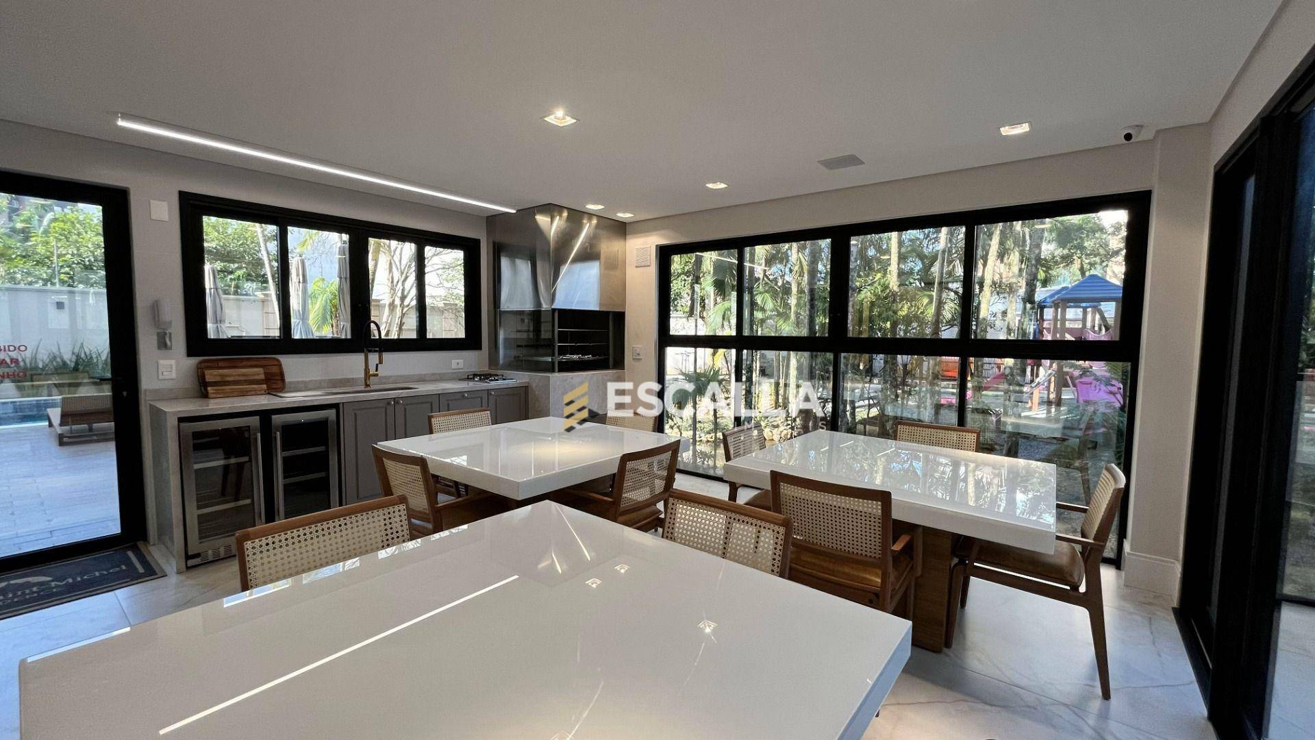 O apartamento possui área privativa de 121 m² e conta com 3 suítes, cozinha, sala de estar e jantar integradas, lavabo e uma ampla sacada com churrasqueira.