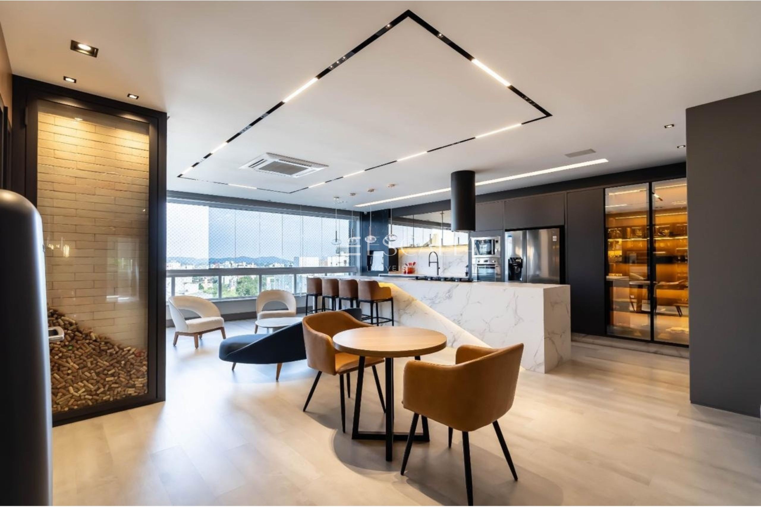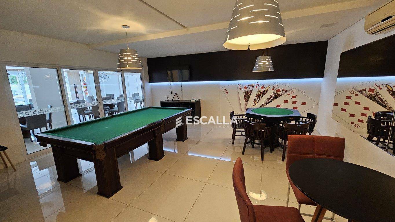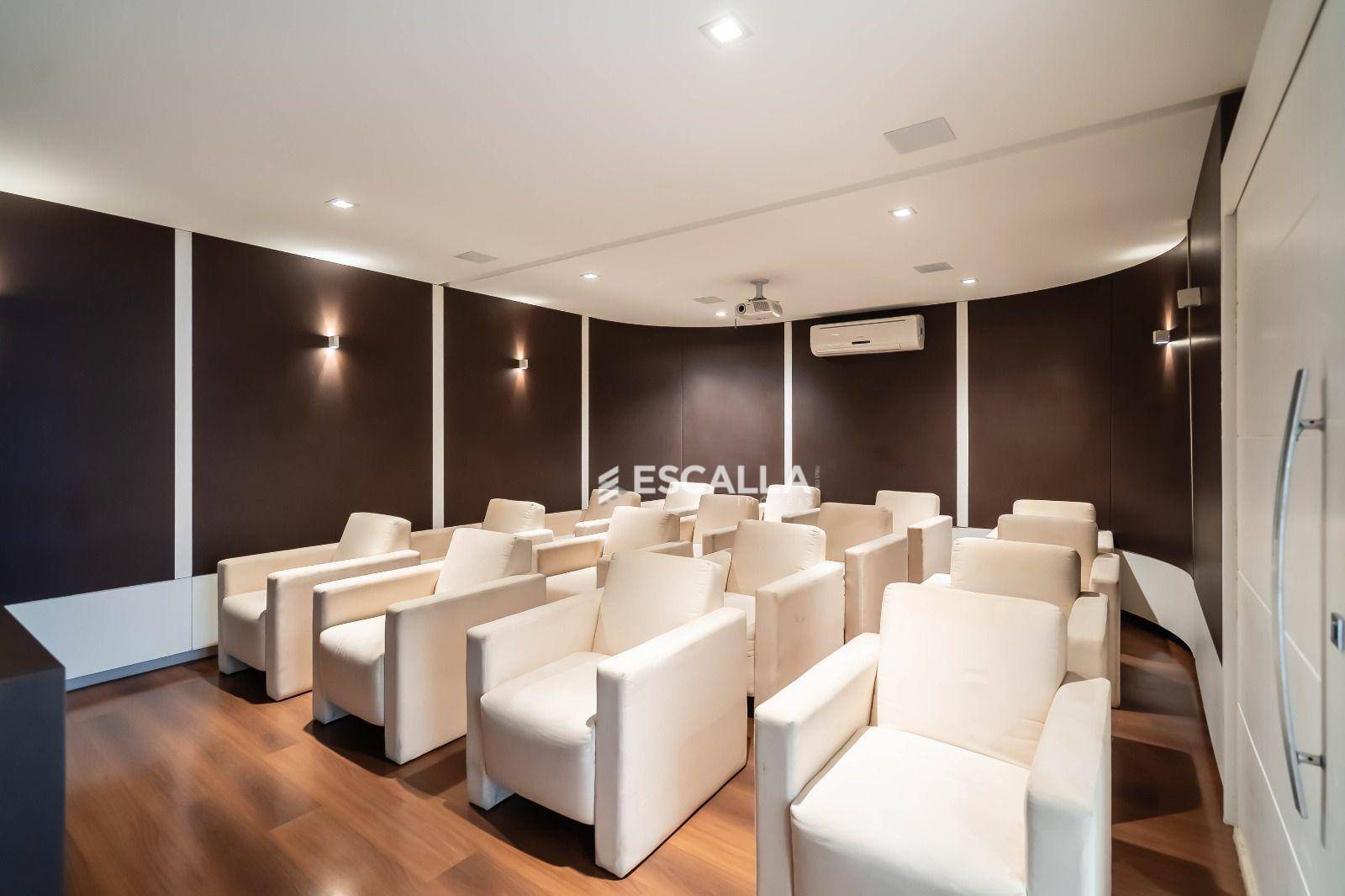 Espaços de convivência elegantes, incluindo salão de festas, sala de cinema e sala de jogos.