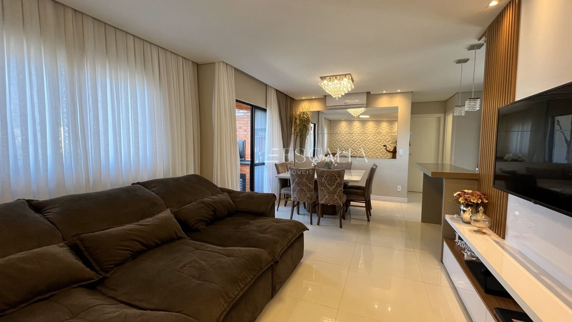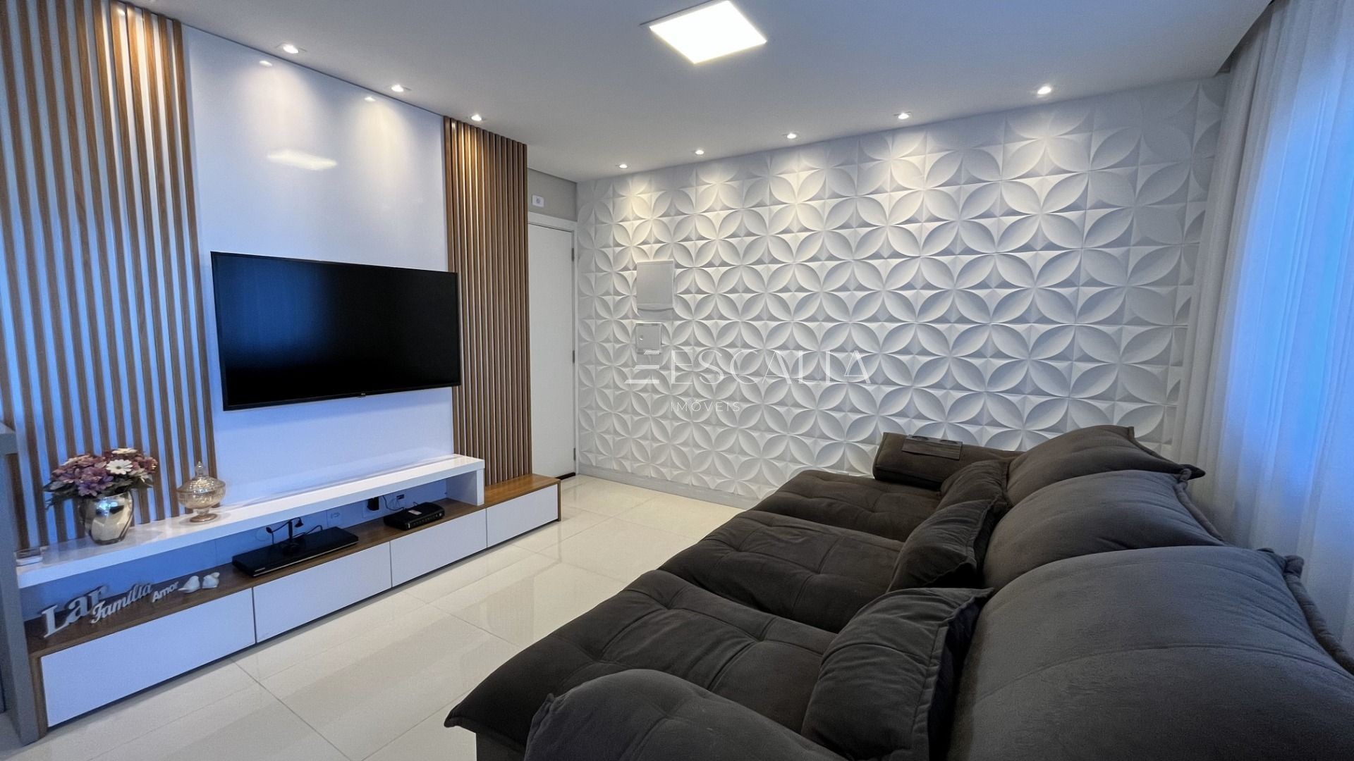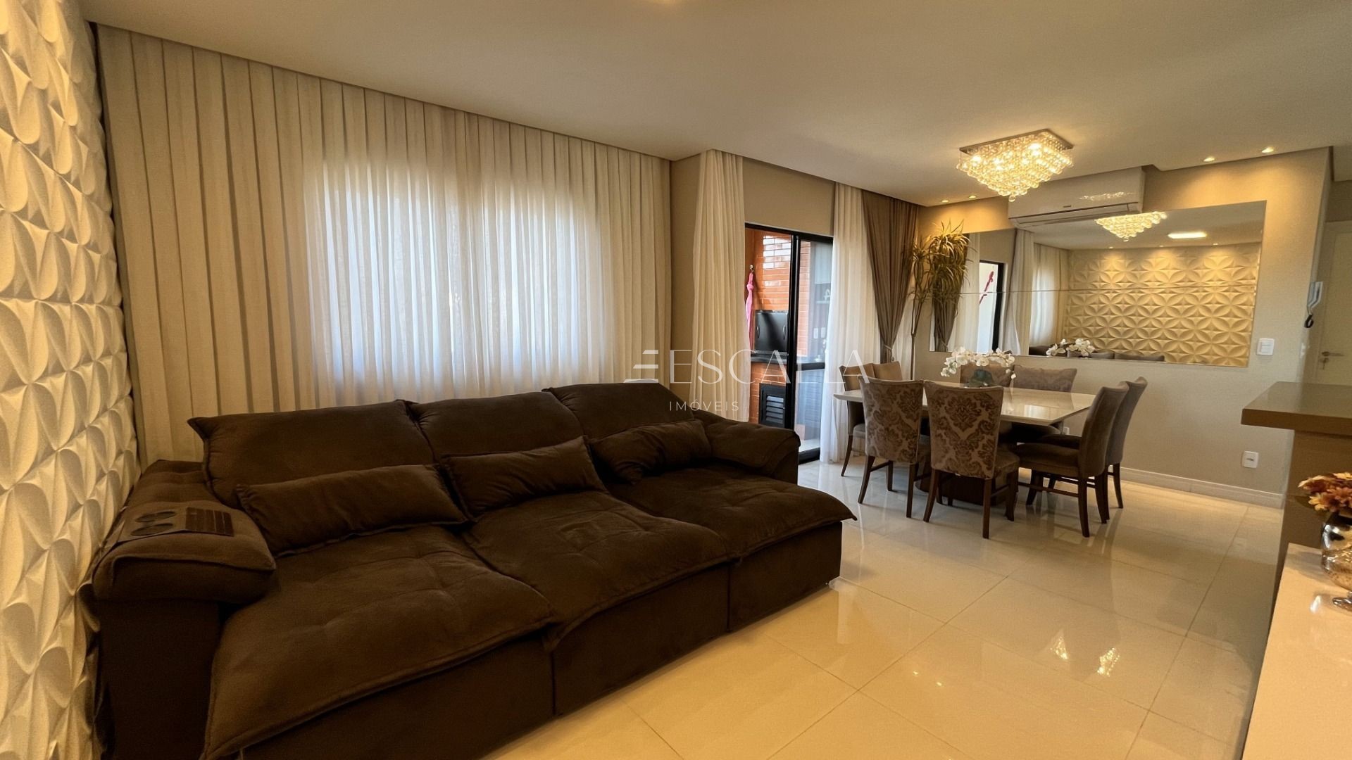 A sala de estar é um espaço aconchegante, perfeito para receber familiares e amigos. Lustres elegantes adicionam charme e requinte ao ambiente, criando uma atmosfera acolhedora.