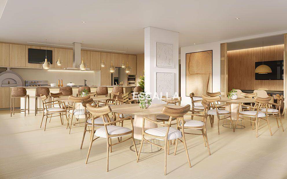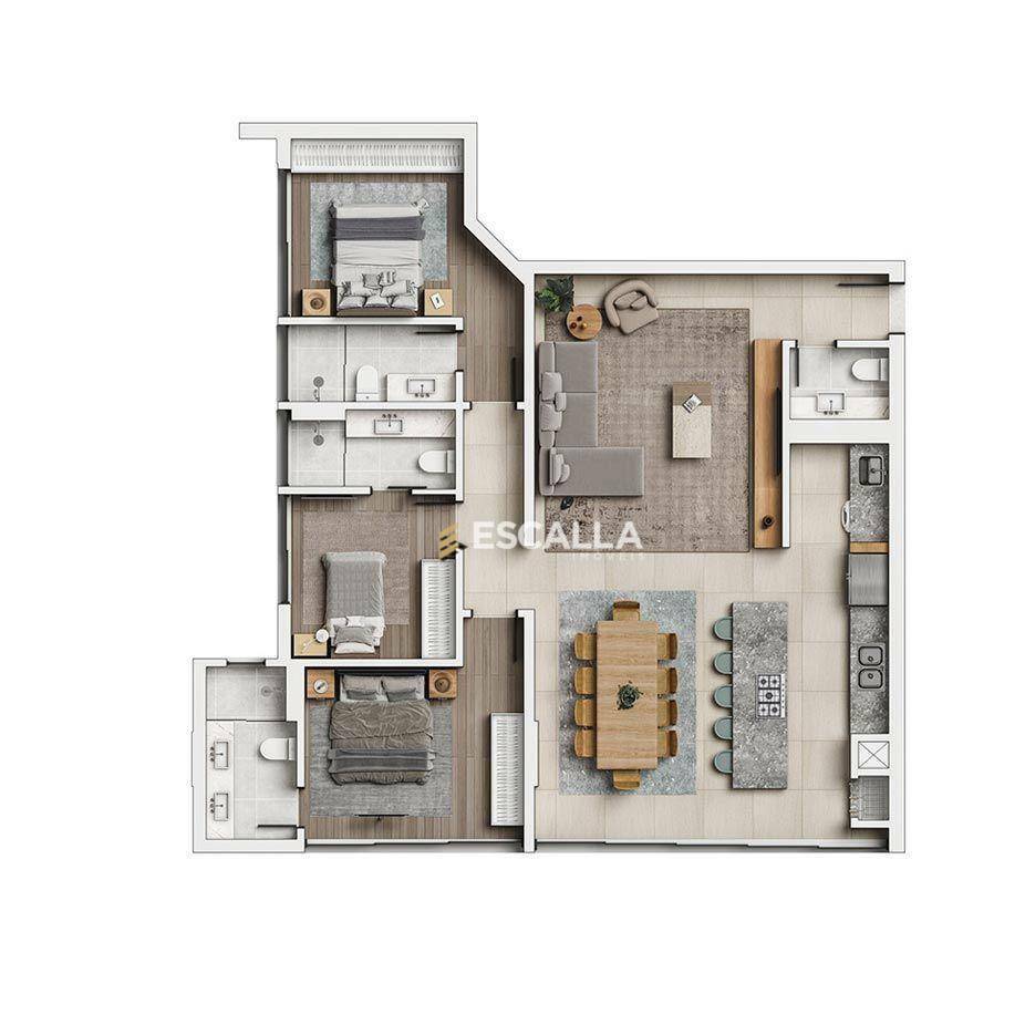 O apartamento é composto por 3 suítes, uma sendo máster, living integrado com a cozinha e área de serviço.