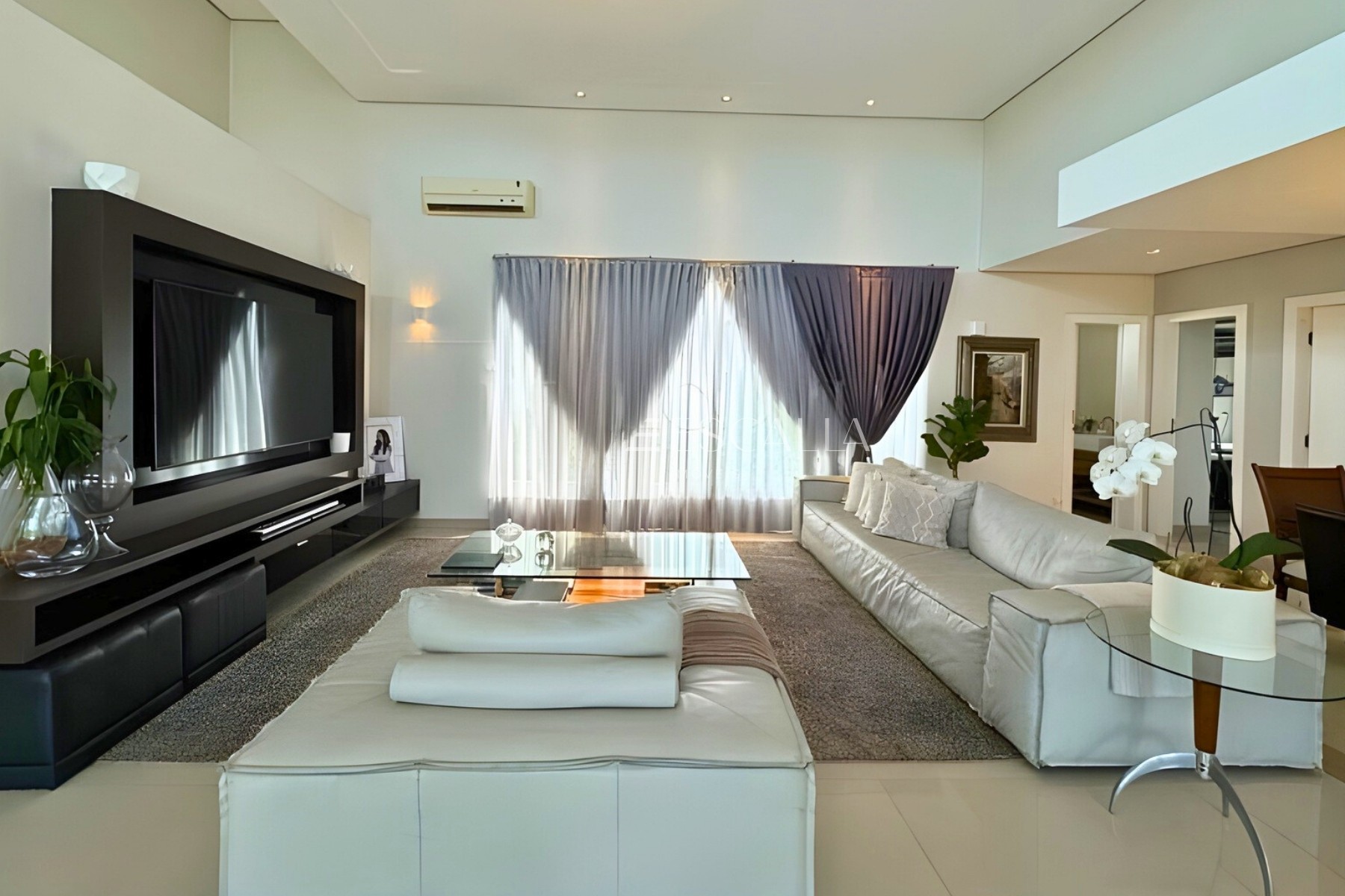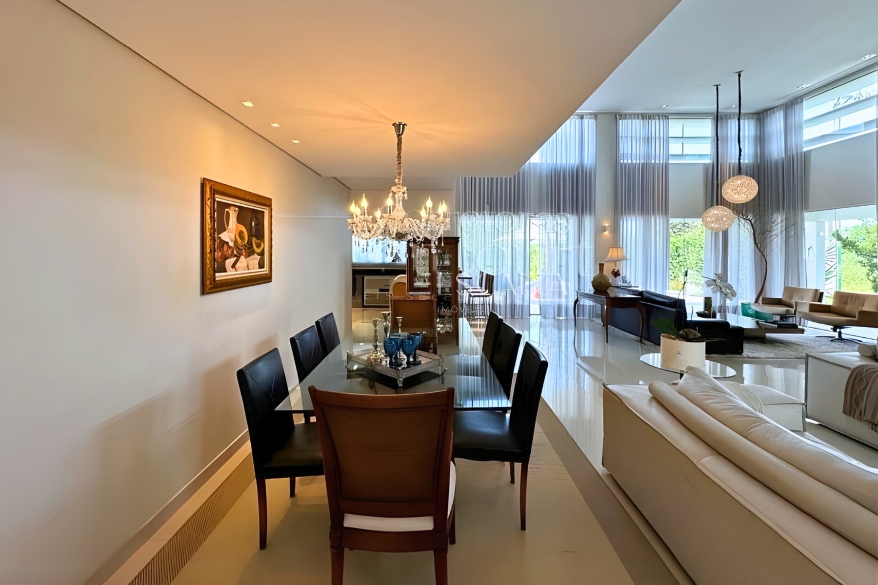 Com 332m² de área construída, o projeto privilegia iluminação natural, circulação fluida e um layout funcional para quem valoriza viver bem e investir com visão de longo prazo. A sala principal com pé direito duplo cria imponência e elegância, enquanto os móveis sob medida em diversos ambientes reforçam praticidade e estilo.