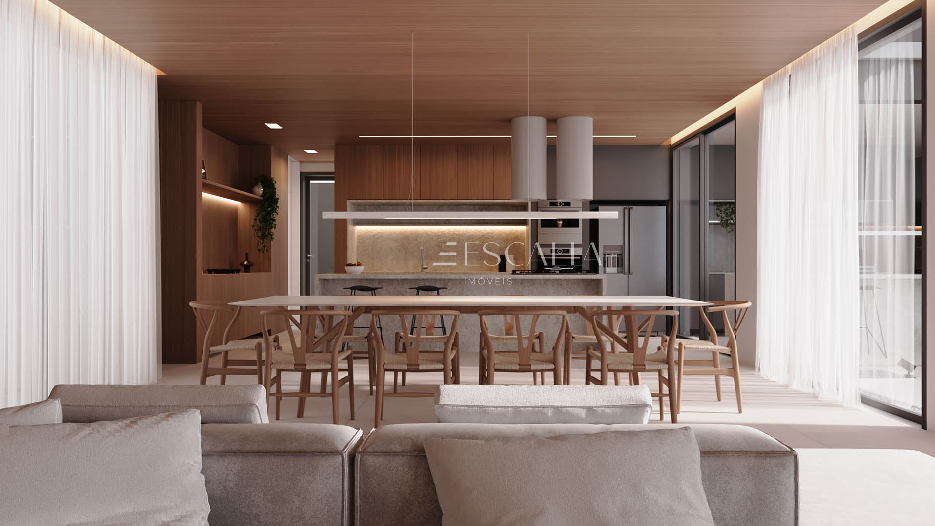 Living, sala de jantar e cozinha integrados à área externa