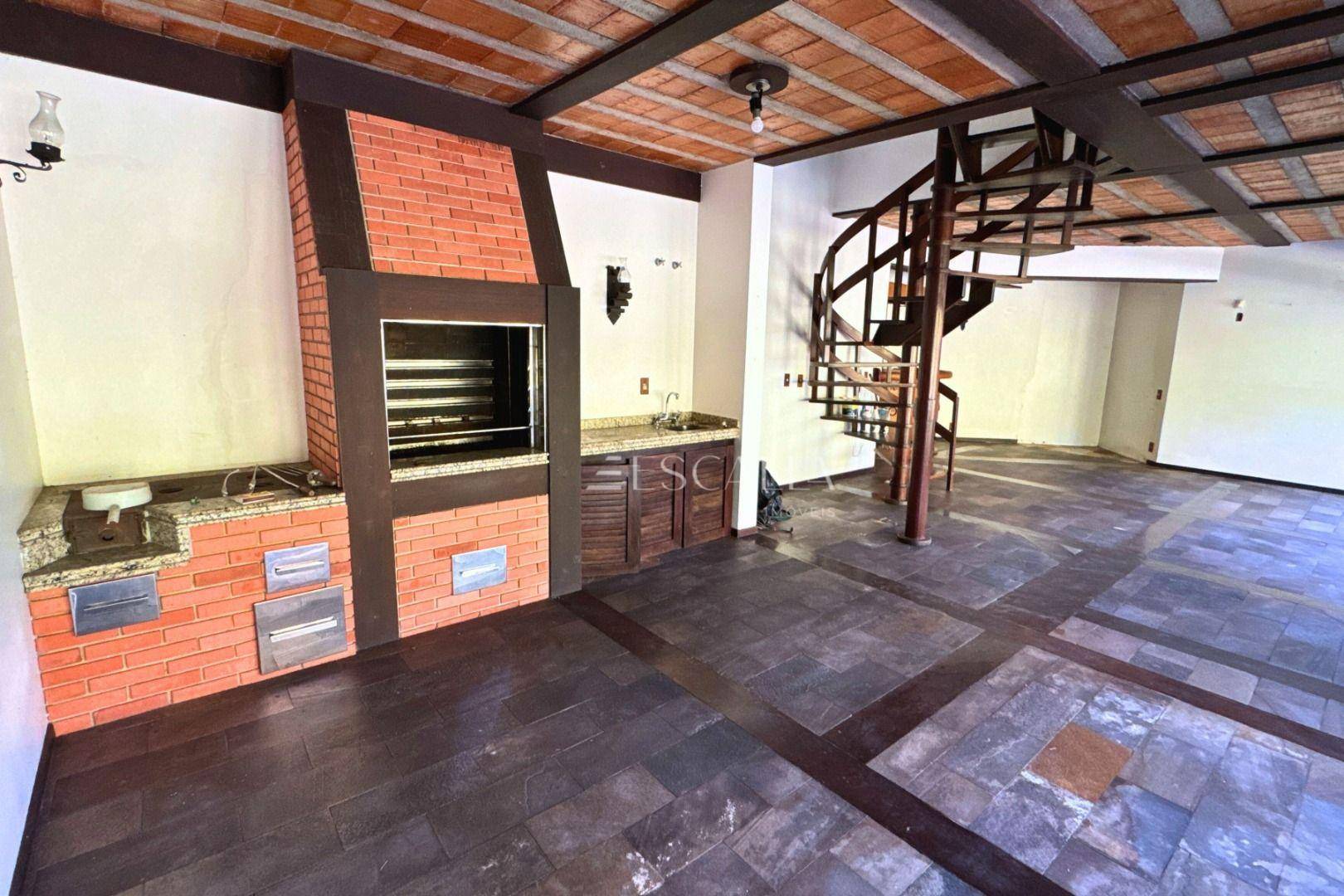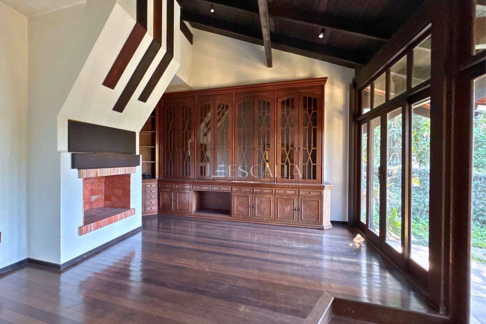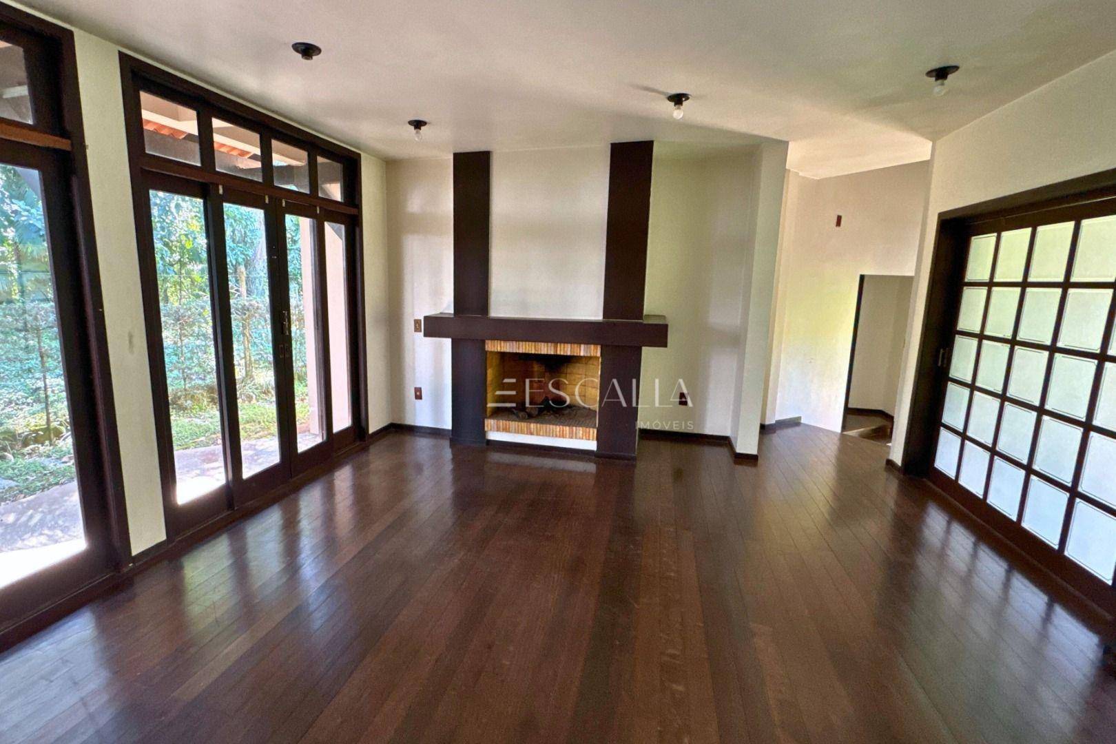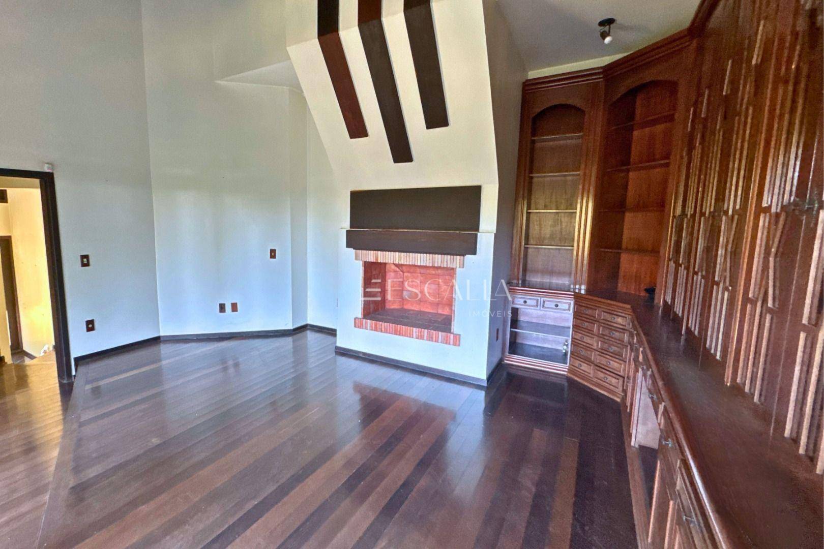 Piso térreo: duas amplas salas com lareira, lavabo, sala de festas com churrasqueira e adega, mezanino, cozinha completa, lavanderia com banheiro, quarto de empregada e garagem para 4 carros com 2 quartos e despensa.