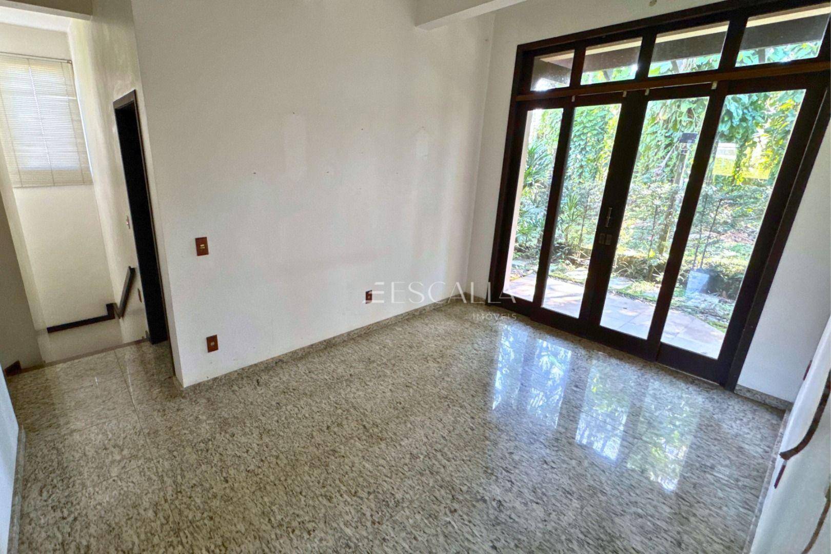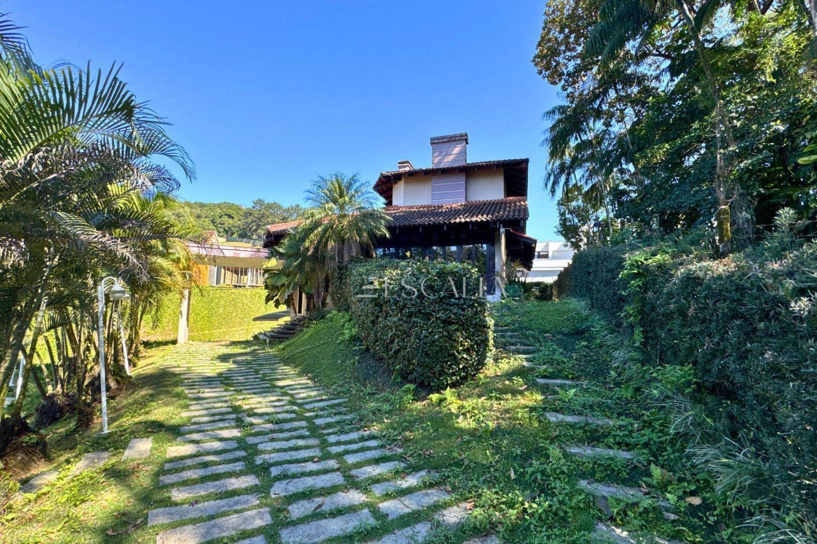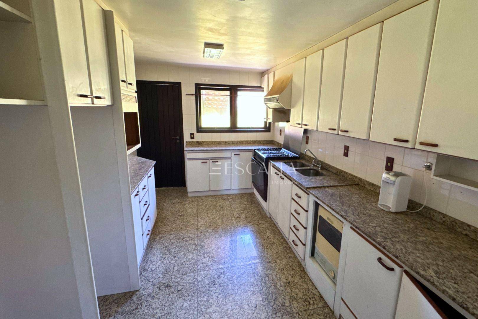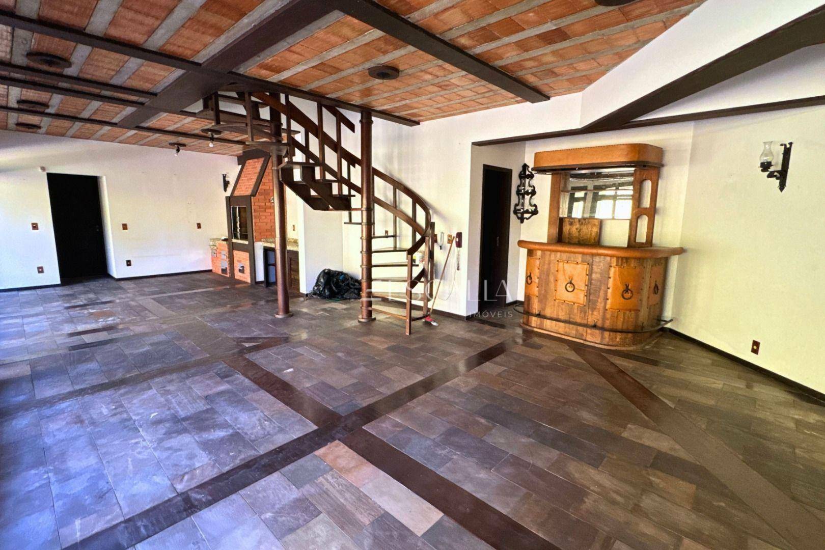 Piso térreo: duas amplas salas com lareira, lavabo, sala de festas com churrasqueira e adega, mezanino, cozinha completa, lavanderia com banheiro, quarto de empregada e garagem para 4 carros com 2 quartos e despensa.