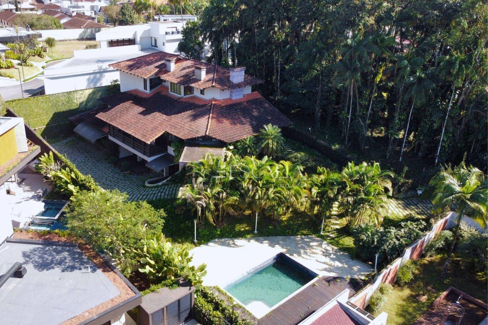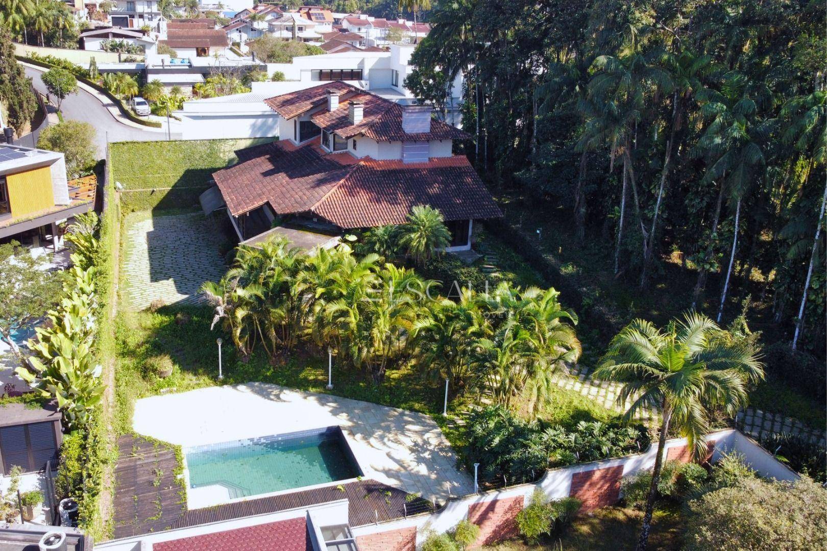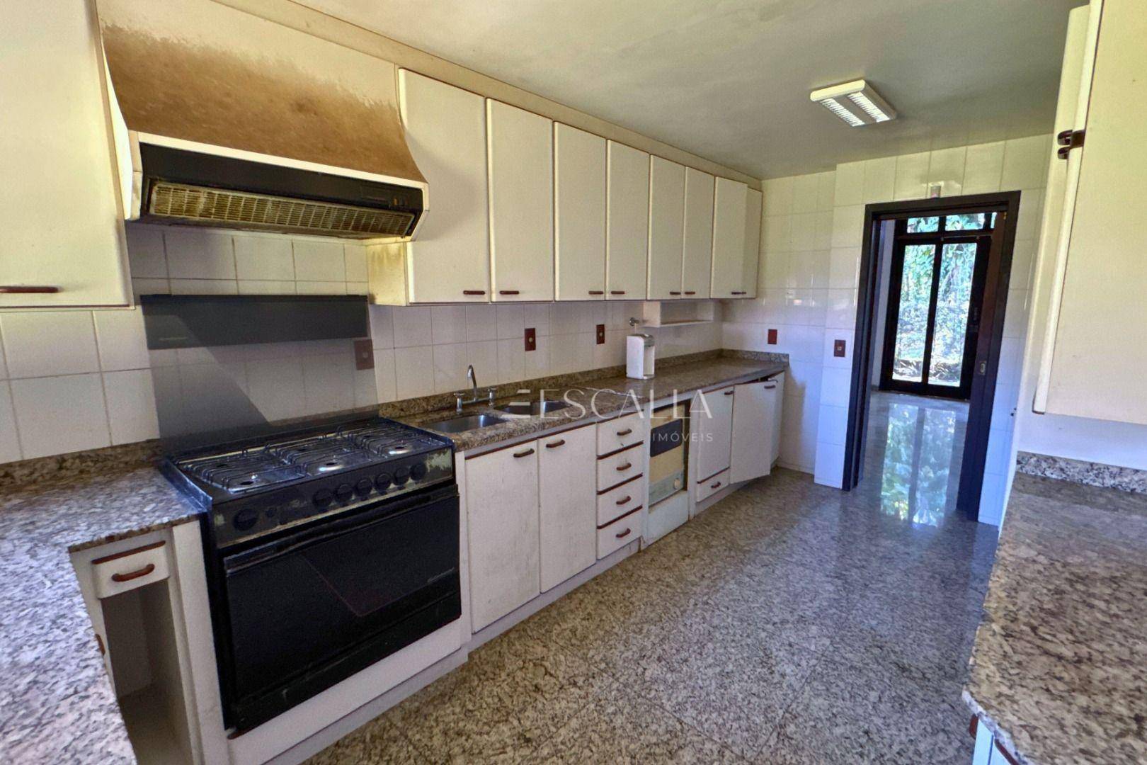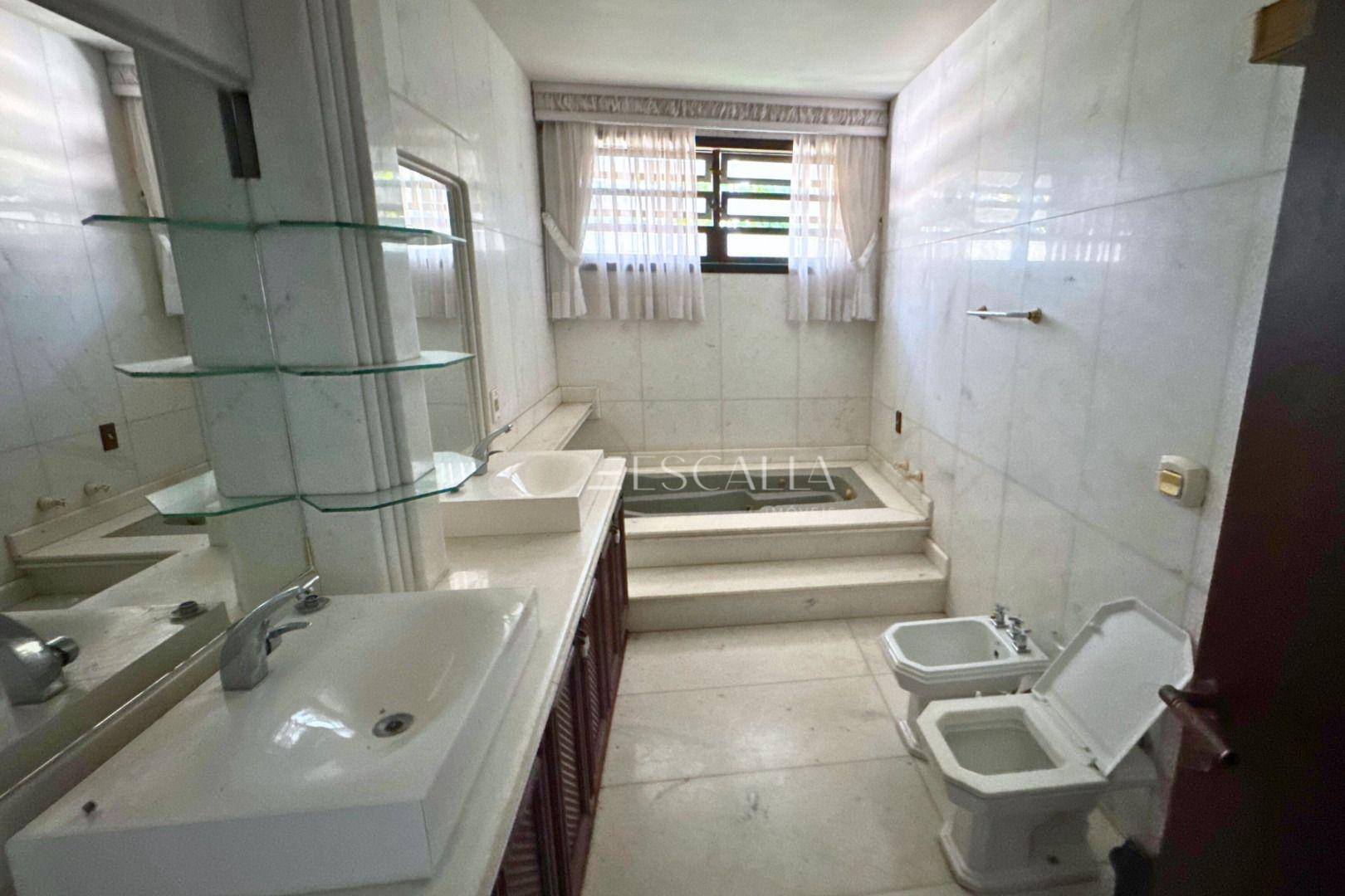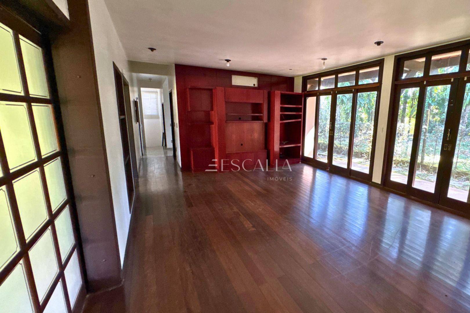Piso térreo: duas amplas salas com lareira, lavabo, sala de festas com churrasqueira e adega, mezanino, cozinha completa, lavanderia com banheiro, quarto de empregada e garagem para 4 carros com 2 quartos e despensa.