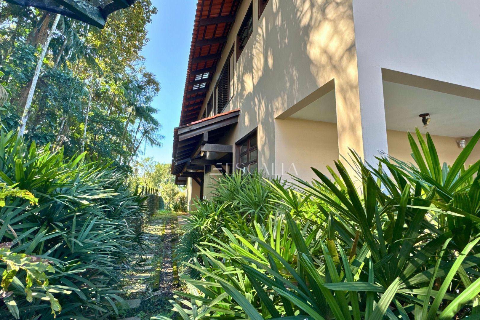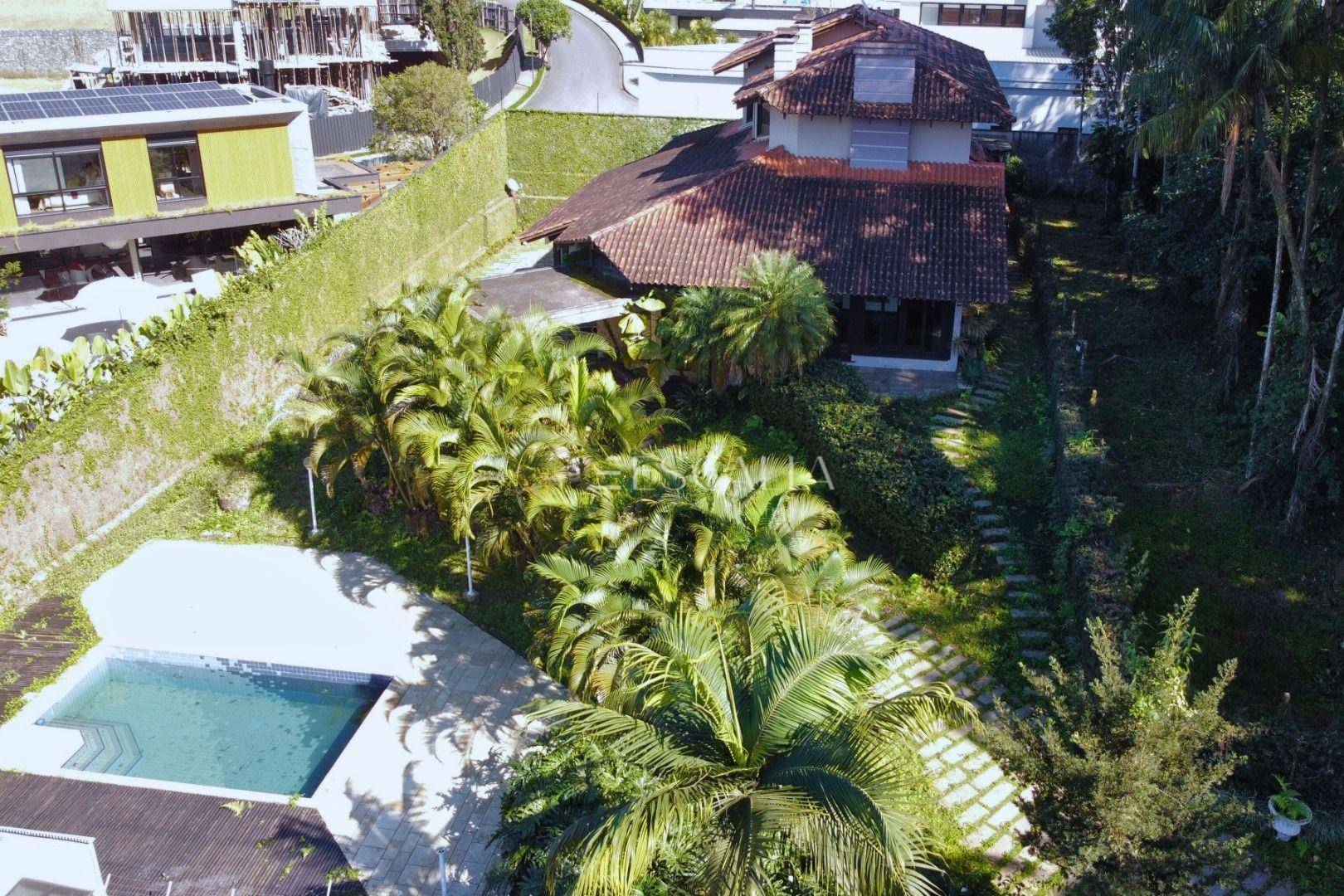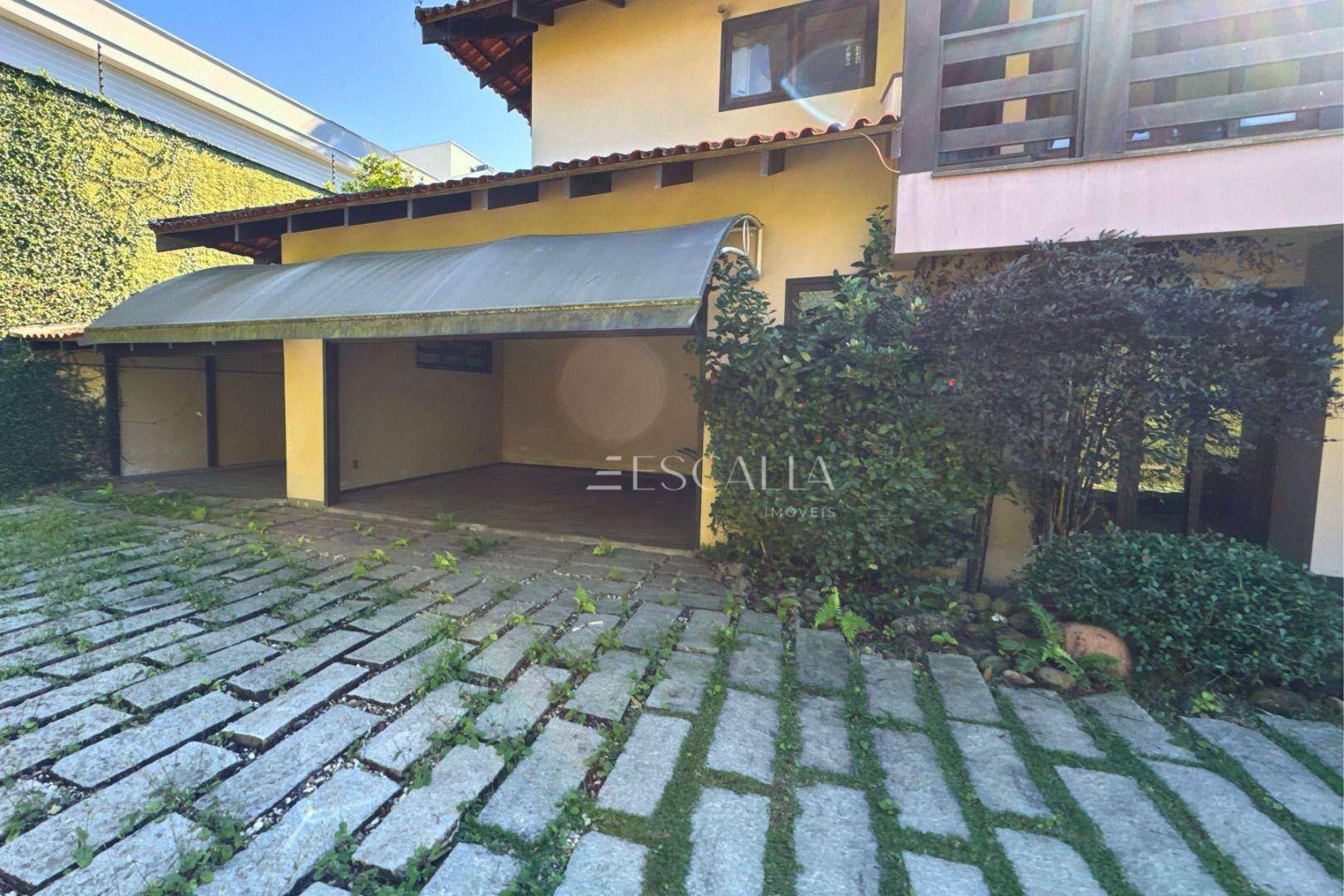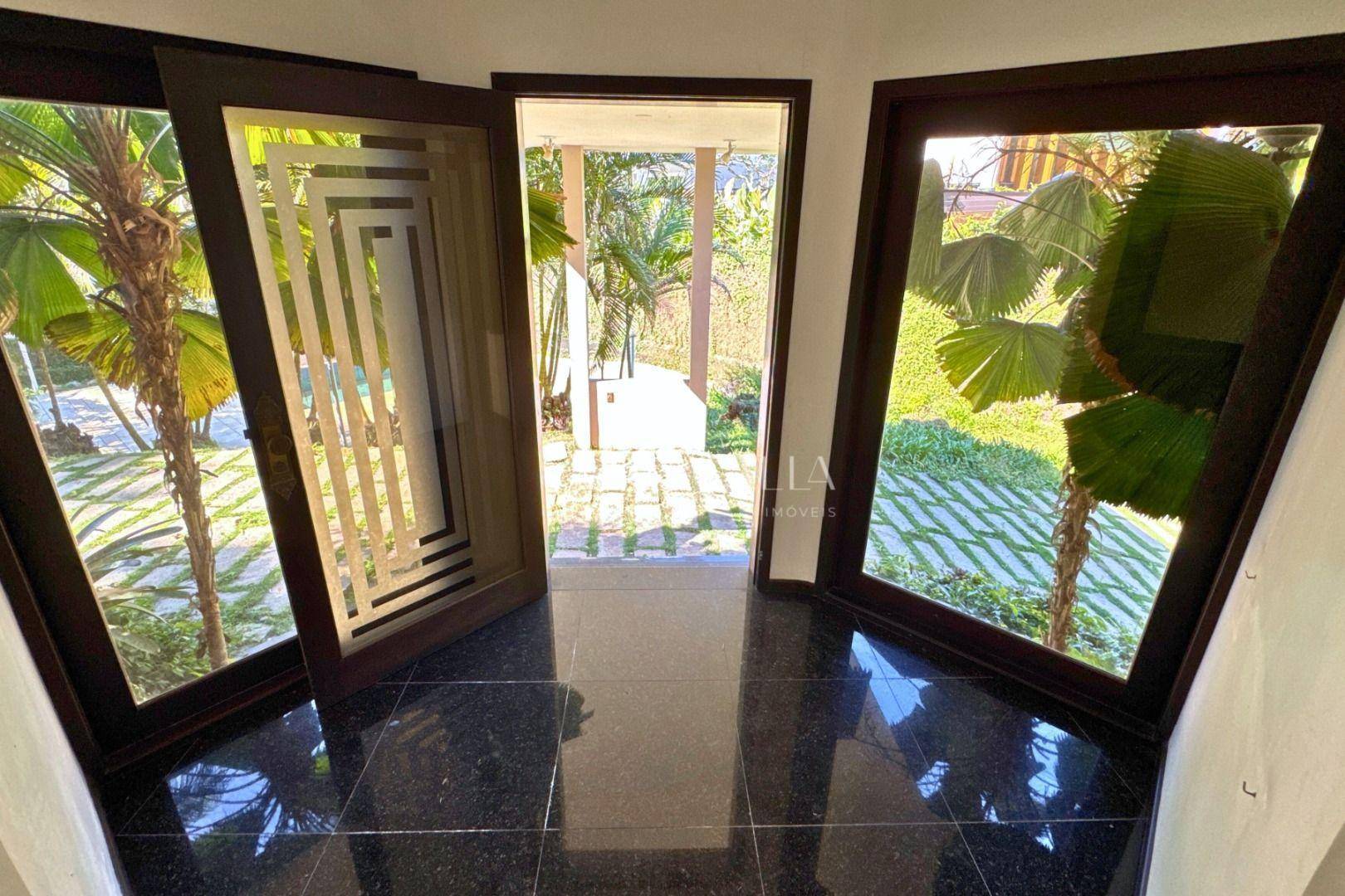 Piso térreo: duas amplas salas com lareira, lavabo, sala de festas com churrasqueira e adega, mezanino, cozinha completa, lavanderia com banheiro, quarto de empregada e garagem para 4 carros com 2 quartos e despensa.